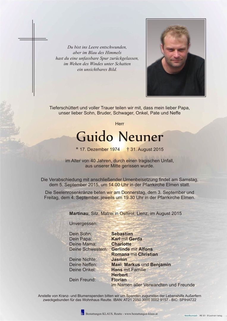 Die Mitglieder des Billardclub Lechaschau trauern um Herrn Guido Neuner, der am 31. August 2015 im Alter von 40 Jahren durch einen tragischen Unfall ums Leben kam. Unser tiefstes Mitgefühl gilt besonders der Familie und den Angehörigen unseres Vereinsmitgliedes. |