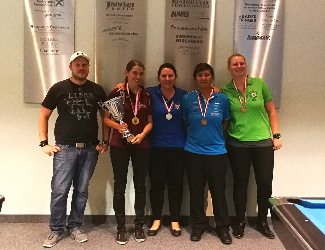 Martina Witting gewinnt den Tiroler Meistertitel bei der 10-Ball Landesmeisterschaft in Lechaschau. Turnierleiter Marc Pichler leitete das Turnier mit acht Teilnehmerinnen, in dem sich Martina Witting im Finale gegen Lisa Plattner durchsetzte und Seychelyne Knapp sowie Alina Steindl auf die Plätze verwies. |